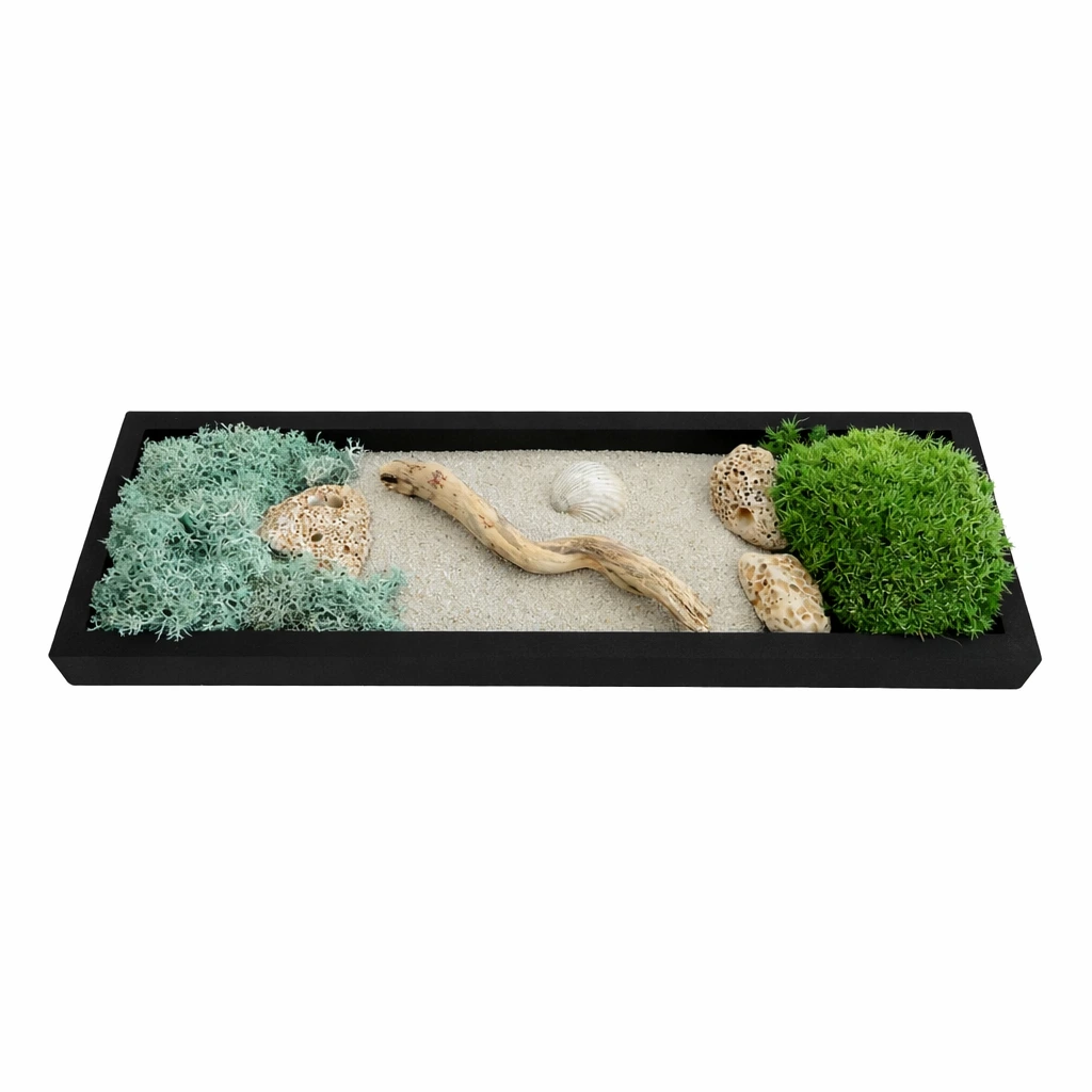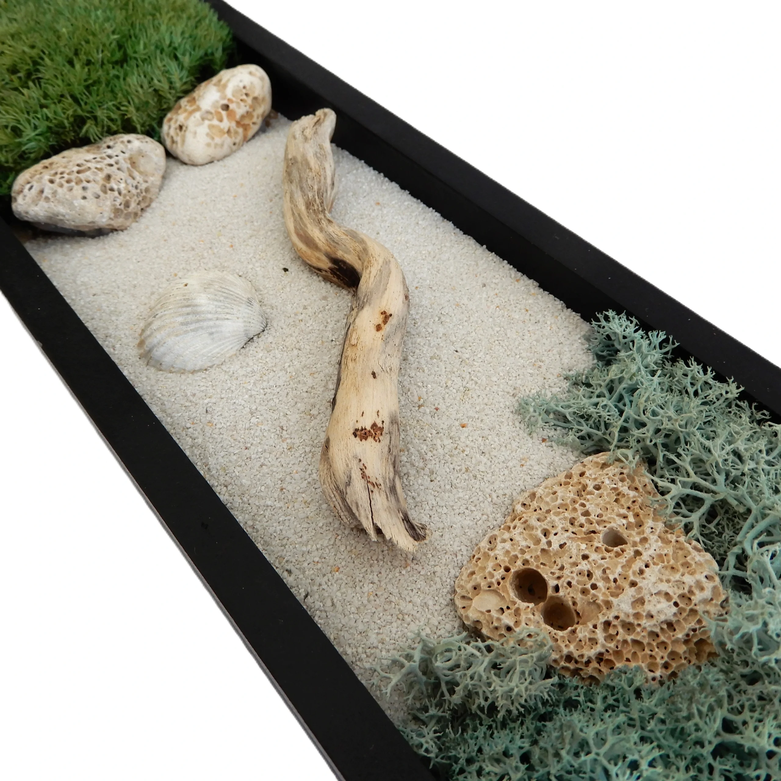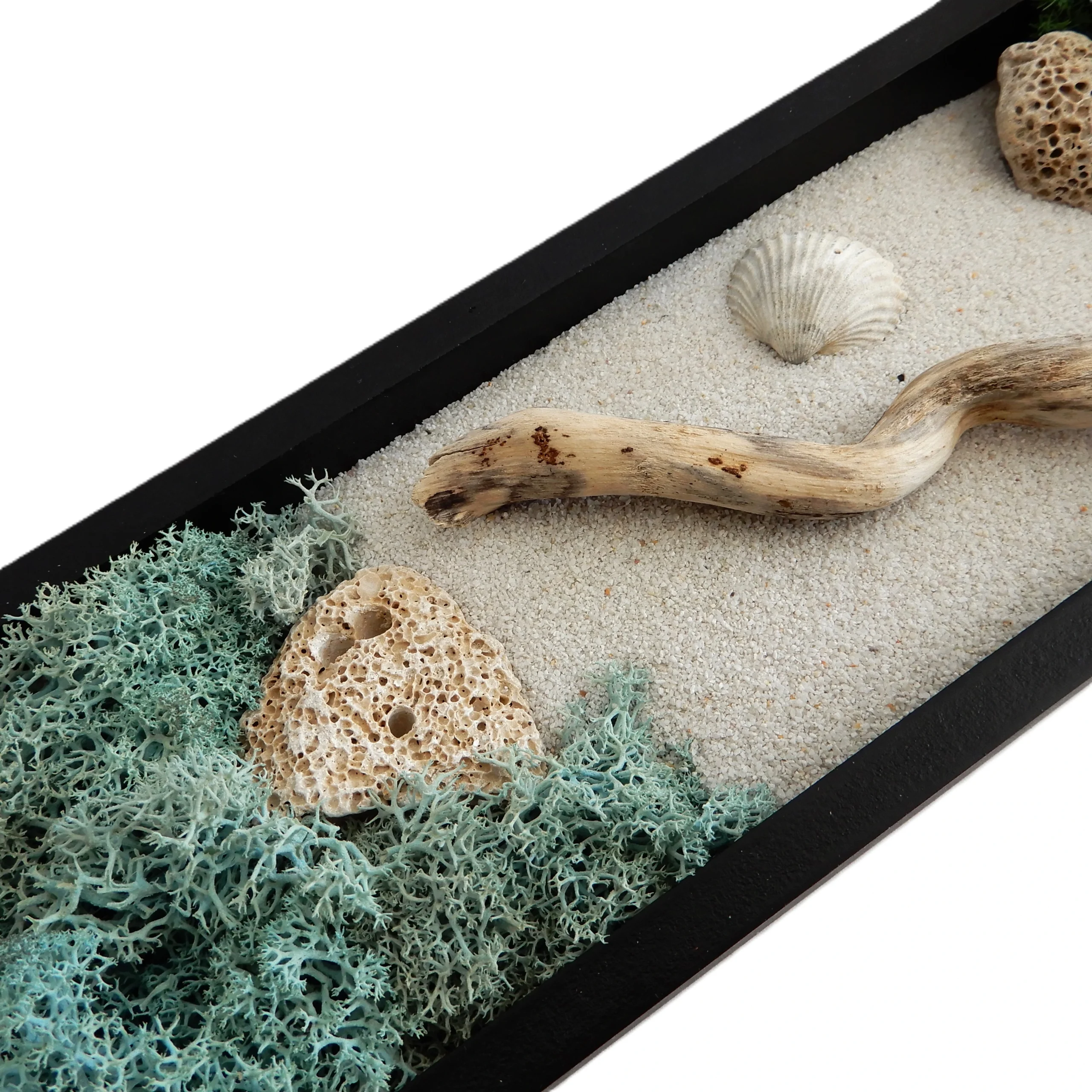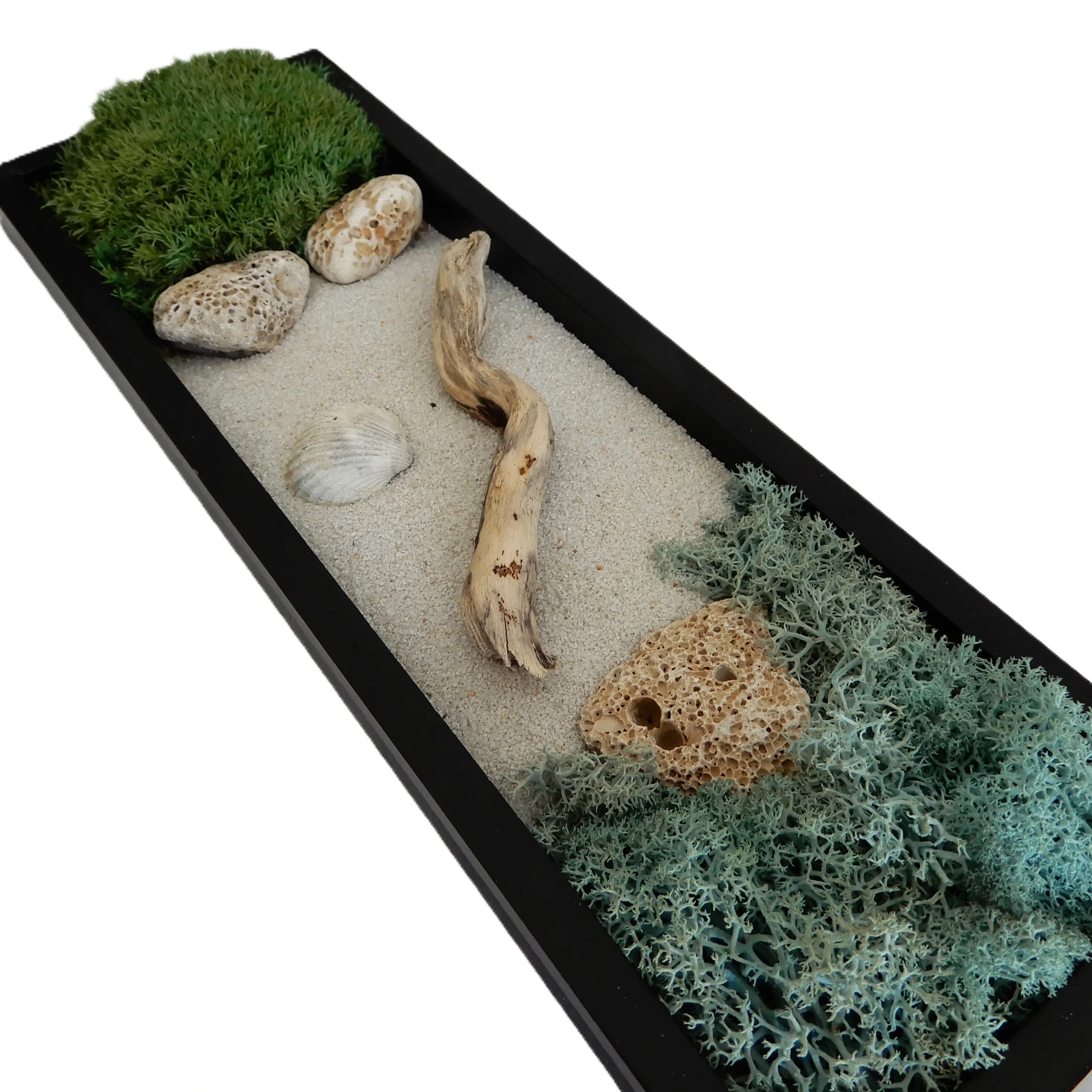 Ročno izdelan iz krogličnega maha in skandinavskega lišaja z dodatki lesa, kamnov in peska.